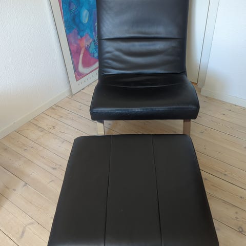 Behagelig læder lænestol med vipbar ryg “sovebeslag” og fodskammel også i ægte læder.