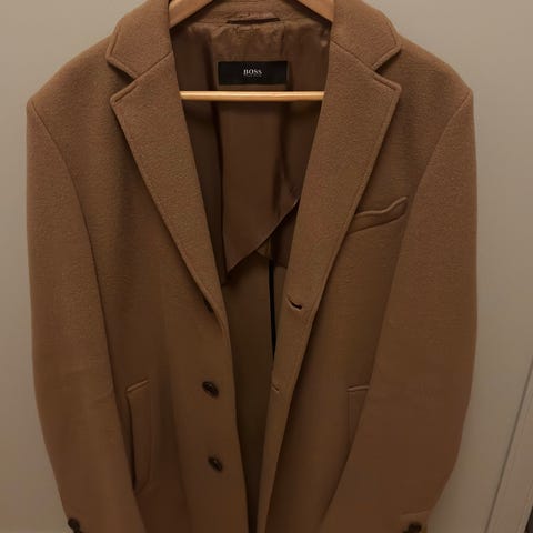 Virkelig flot og lækker herrefrakke i uld fra Hugo, str. M/50. Lang model (går ned over knæene). Nypris 4.500 kr., kun brugt 2 gange.