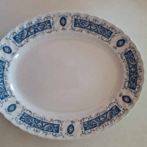 Ovale fad i porcelæn med dekorative, blå blomster- og bladmotiver.,Afhentes i:,Røde Kors Østbirk (609),Bemærk at mail, chat og beskeder ikke besvares, og varen skal købes på knappen "Gå til varen"