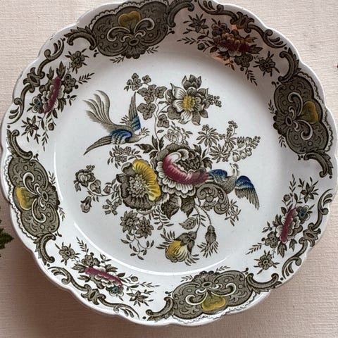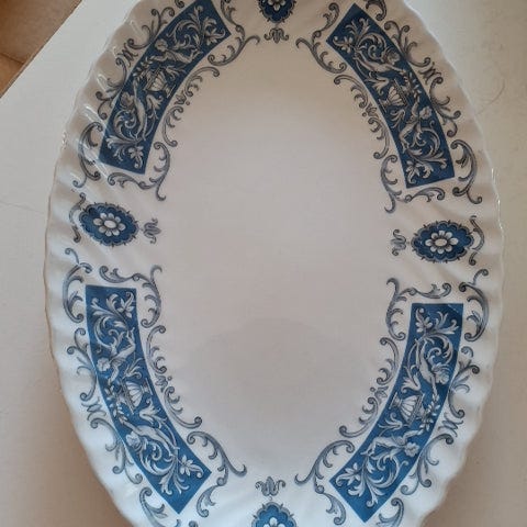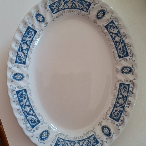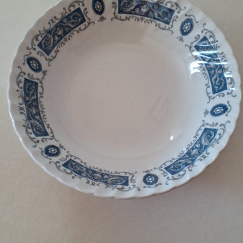 Den dybe tallerken har en dekorativ kant med blå mønstre og er lavet af porcelæn.,Afhentes i:,Røde Kors Østbirk (609),Bemærk at mail, chat og beskeder ikke besvares, og varen skal købes på knappen "Gå til varen"