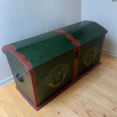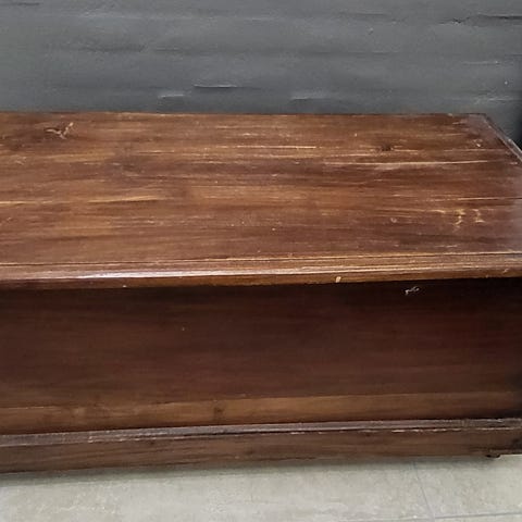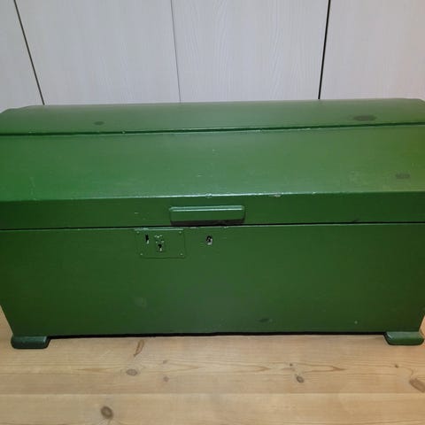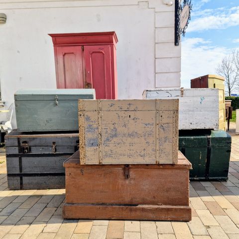 Jeg har to store kister som er med fladt låg og på hjul. Du kan sidde på dem eller stille ting på dem.