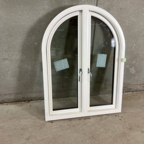 Vindue med buet top i træ. Består af flere vinduesrammer, der kan åbnes. Velegnet til installation i bygninger, hvor et dekorativt vindue ønskes. ca. 2m x 2m.