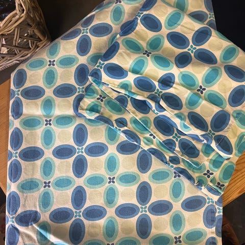 1. sæt: Sengesæt, dyne mangler en bændel. Retro, men i pæn stand og med flotte farver (150 kr)