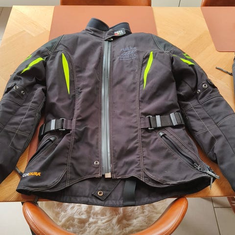 Jakke og busker er sorte. Jakken har ryg og albue beskyttere og bukserne har knæ beskyttere. Jakken har inderfor, der kan lynnes af. Bukserne kan lynnes på jakken. Kun brugt få gange.