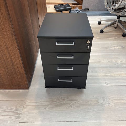 EP Xtra kassette med 3 skuffer, nederste er til evt. hængemapper, med centrallås som låser alle 3 skuffer på en gang og 2 nøgler medfølger, 4 hjul hvoraf 2 kan låses, mål: D:50 x B:42 x H:64, fejer intet, fin stand. Pris pr. stk. 450kr. 2 stk. 700kr