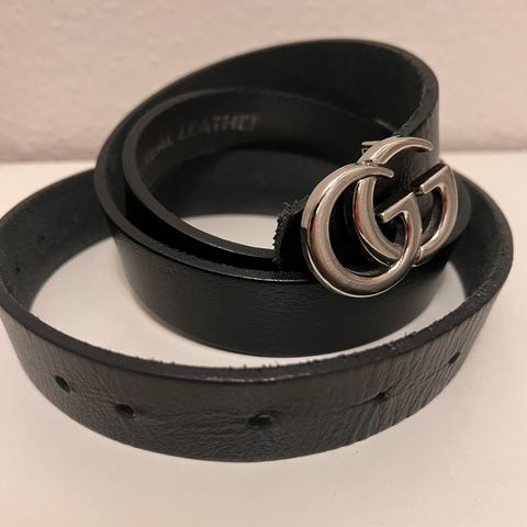 Mørkeblåt bælte. Næsten som nyt. 6 cm bredt. Længde 113 cm målt INKL spænde. Forsendelse 50 kr.