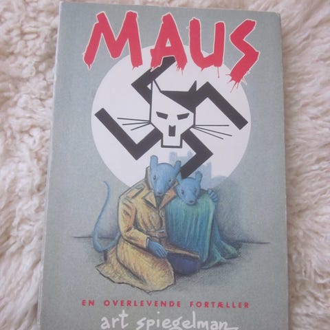 Art Spiegelman Maus er en tegneserie bog i sort/hvid, som indeholder en overlevendes fortælling i to bind. Bogen indeholder detaljerede illustrationer og tekst, der skildrer historiske begivenheder gennem tegneserieformatet.
