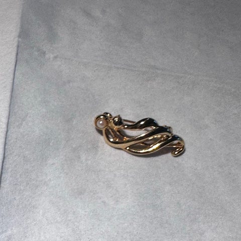 Smuk vintage broche. Mid century. Rundt design i messing-look med fine detaljer og en midtersten i iriserende glas (skifter farve i lyset). Klassisk solstråle-mønster med dekorativ kant.