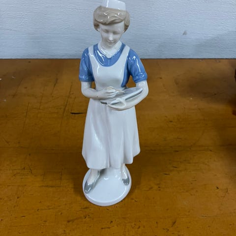 Vintage porcelænsfigur af sygeplejerske klar til stuegang med journal/ notesblok og skriveredskab i hænderne.