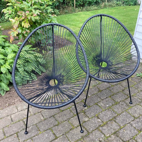 Acapulco Stol med rund form, brun farve, lavet af metalramme og plasttråde. Stolen har et karakteristisk design med strenge, der danner sædet og ryggen. Velegnet til indendørs brug.