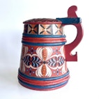 Almue lågkrus i dekoreret træ, et charmerende og velbevaret stykke nordisk brugskunst fra slutningen af 1800-tallet. Kruset er dateret 1898 og dermed ca. 125 år gammelt. Konstruktionen står solidt med både stave og tøndebånd intakte, hvilket vidner om en dygtig håndværkertradition og omhyggelig opbevaring gennem generationer. Overfladen bærer enkelte små og ubetydelige afslag i malingen, helt i tråd med den naturlige patina, man forventer af et ægte almueobjekt. Låget er signeret og forsynet med årstal med blyant, en detalje der understreger det personlige præg og den individuelle fremstilling. Stilmæssigt og håndværksmæssigt peger kruset mod svensk almueproduktion, hvor farver, ornamentik og konstruktion ofte følger regionale traditioner. Træsorten er ikke endeligt identificeret, men duften og strukturen antyder enebærtræ, kendt for sin karakteristiske peberduft og hyppige anvendelse i nordiske brugsgenstande. Et særdeles dekorativt og autentisk lågkrus, hvor både alder, håndværk og kulturhistorie går op i en harmonisk helhed.