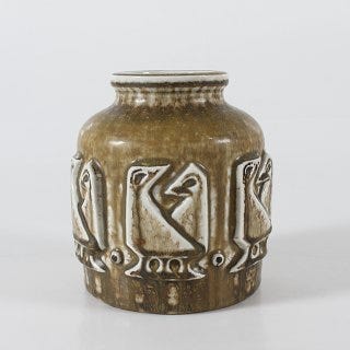• Model 21925 – kvadratisk “tobakskrukke”-form, ca. 14–15 cm, signeret med JM og tre bølger. Pris: 1.450 kr.