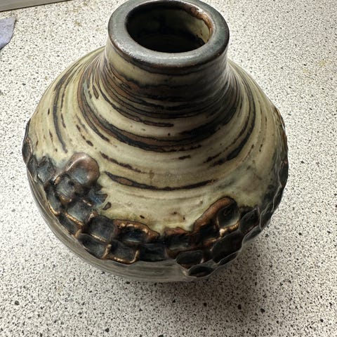 • Model 21484 – rund vase, ca. 16 cm, ligeledes med JM og tre bølger. Pris: 1.200 kr.