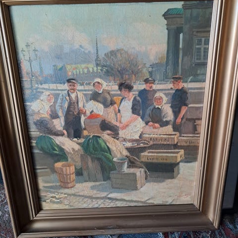 Et af Bjulfs (1890-1958) favorit motiver fra København. Et meget personligt portræt af en fiskerkone, hendes bestemte personlighed lyser ud af billedet.