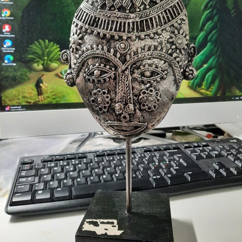 Metalmaske fra Bali i træramme. Maskens “spyd” kan rokke en anelse, men ikke noget der overhovedet har betydning. Måler ca 35 x 26 cm