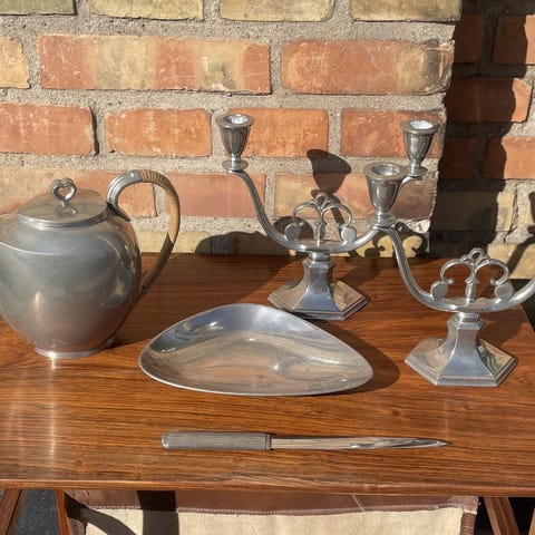 Jeg sælger lidt ud i en samling af Just Andersen. Der er lysestager, en vase, en olielampe og en skål. Lysestage parrene er alle i pæn stand, den enkelte lysestage i midten har tydelige brugsspor, samt har vasen. Den lille skål/fad har en reperation i det ene håndtag. Byd gerne på en eller flere ting der har interesse. Ser gerne bud starte ved 75, men jeg kan også give en god samlet pris på flere ting eller det hele.