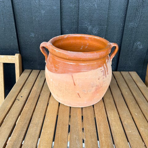 Keramik med kurvehank. Ca 13 cm høj + hank. Diameter ca 23 cm. Lille afslag inderst i kanten - se billeder