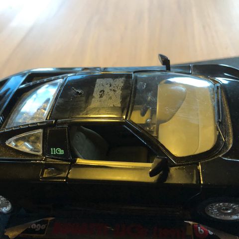 Bugatti EB110 modelbil i blå farve med detaljeret design. Modellen har en realistisk kabine og aerodynamisk form, som afspejler den originale sportsvogn.