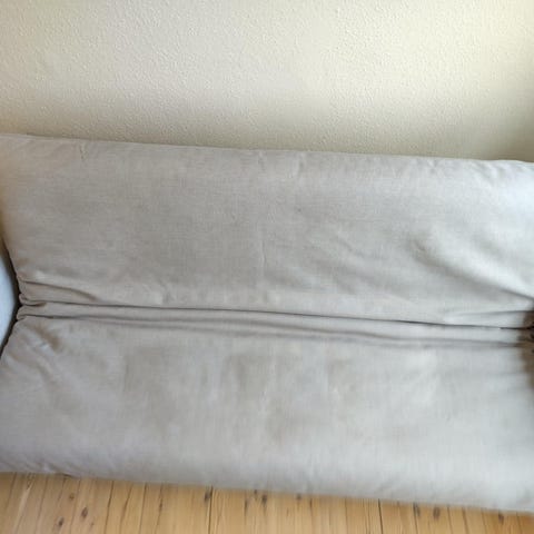 Futon sovesofa med beige betræk og ben i træ. Sofaen har et enkelt og funktionelt design med mulighed for at omdanne til en seng på 140x200. Passer til mindre rum eller som ekstra soveplads. En lamel mangler, men den er let at udskifte.