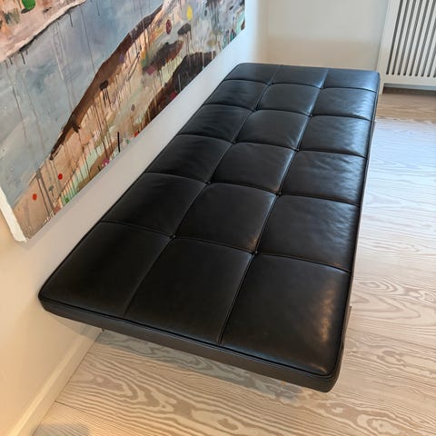 Poul Kjærholm PK80 daybed betrukket med originalt sort aura læder og med stel af stål. Daybeden er fra 2019 og fremstår i god stand med minimale brugsspor. •Designer: Poul Kjærholm •Producent: Fritz Hansen •Produktions år: 2019 •Model: PK80 •Mål: Højde 30 / Bredde 190 / Dybde 82 Cm •Materialer: Sort aura læder •Stand: Brugt Poul Kjærholm PK80 daybed i sort aura læder.