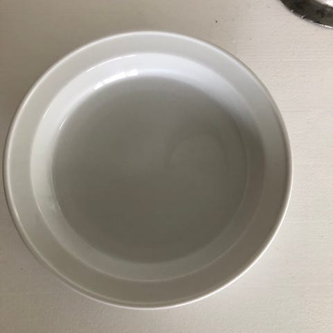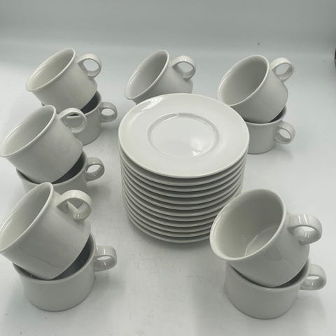 Royal Copenhagen tallerken og kop sæt bestående af hvide porcelænstallerkener og kopper. Sættet indeholder 12 stk af hver kop og tallerken samt underkop