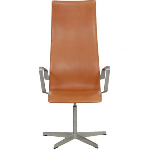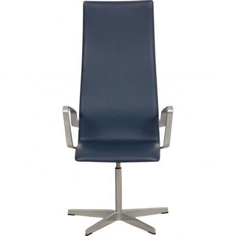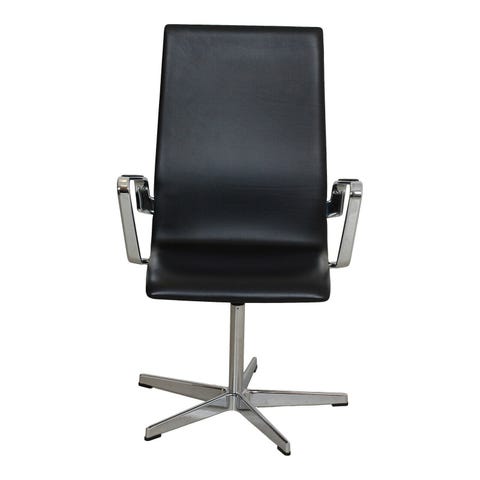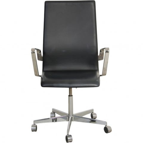 Arne Jacobsen Oxford stol mellemhøj betrukket med originalt sort Essential læder og med et chrome stel. Stolen er fra omkring år 2006, og fremstår i pæn stand med let patineret læder, og med et par små ridser på armlænene. Stolen har bløde hjul til hårde gulve.•Designer: Arne Jacobsen •Producent: Fritz Hansen •Produktions år: Omkring 2006 •Model: Oxford stol mellemhøj •Mål: Højde 101-116 / Bredde 60 / Dybde 78 / Sædehøjde 41-56 Cm•Materialer: Sort Essential læder, chrome stel •Funktioner: Højdejustering, vippefunktion, og hjul•Stand: Brugt Arne Jacobsen Oxford stol mellemhøj i sort Essential læder.