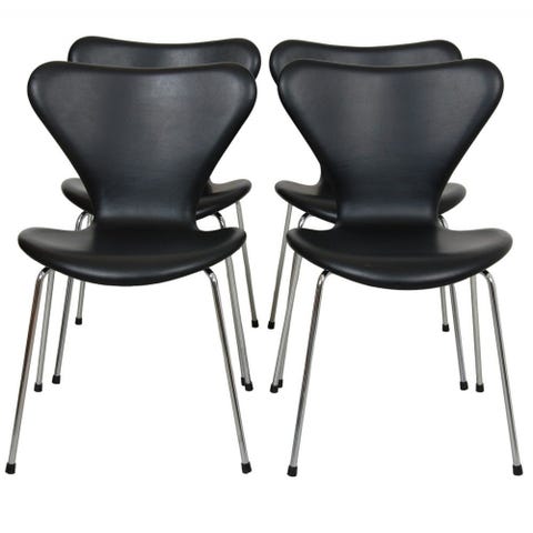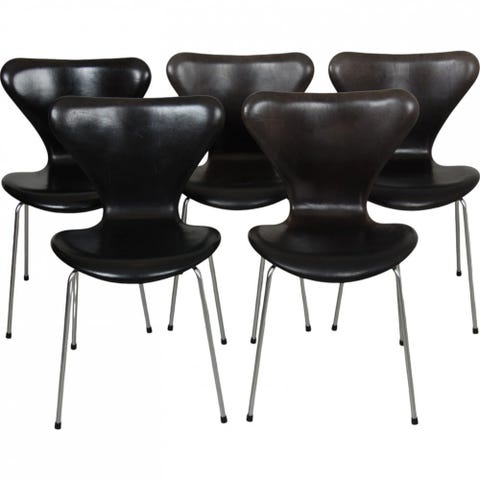 Sæt med 6 Arne Jacobsen Syver stole i sort læder