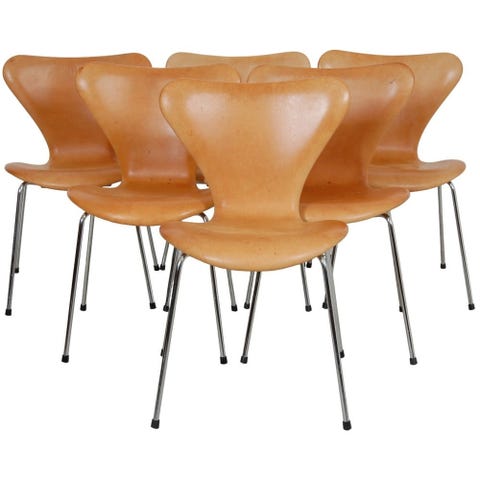 Sæt med 6 Arne Jacobsen Syver stole betrukket med sort semi anilin læder og med stel af krom. Stolene er fra 1984, men blev omkring år 2010 ombetrukket i det nuværende læder. Læderet fremstår i god stand, dog med let patina. Stolene har fast ryg og er fuldt betrukket med sort læder, og de står på krom ben. •Designer: Arne Jacobsen •Producent: Fritz Hansen •Produktions år: 1984 •Model: Syver stol •Mål: Højde 78 / Bredde 46,5 / Dybde 42 / Sædehøjde 44,5 Cm •Materialer: Sort semi anilin læder og krom ben •Stand: Brugte Arne Jacobsen Syver stole i sort læder