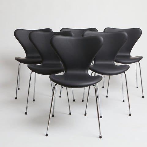 Sæt af 6 Arne Jacobsen syv stol i brandy læder og med sort ben