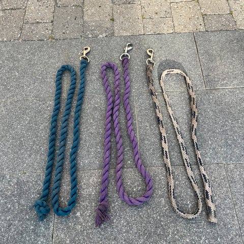 Ubrugt helt nyt, flot og kraftigt 3 meter langt Waldhausen træktov til horsemanship med roterende karabinhage og lædersnert i enden. Nypris kr.239. Sælges for kr.100,-