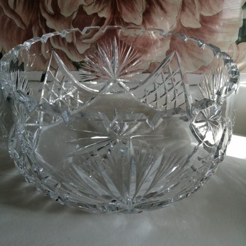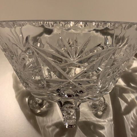 Fin gammel krystalskål på 3 fødder, stor, Ø21 cm, H10,5 cm. I god stand med almindelige brugsspor og ingen skår/skader. Fra et røg- og dyrefrit hjem.