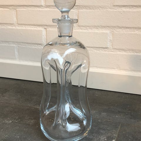 Holmegaard Glas Karaffel i klart glas med unik formgivning. Karaffelen har en prop, og dens design inkluderer bølgende og rynkede detaljer. Velegnet til opbevaring og servering af drikkevarer.