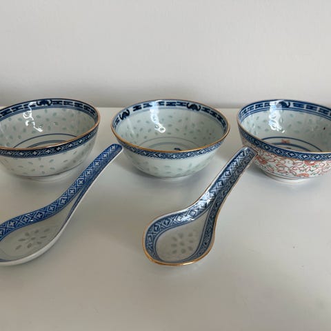 Porcelæn, 3 stk. kinesiske skåle incl. 3 stk. skee