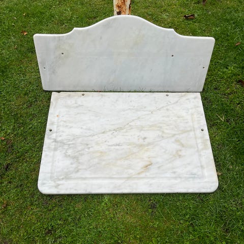 Servante marmorplade i hvid marmor. Jeg ved ikke om mærke kan fjernes.