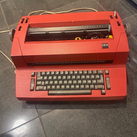 En klassisk IBM elektrisk skrivemaskine (Selectric) i en sjælden rød farve.