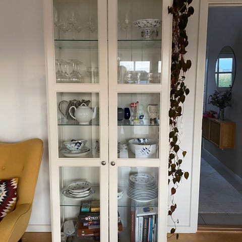 Hvidt vitrineskab med glasrude og hylder