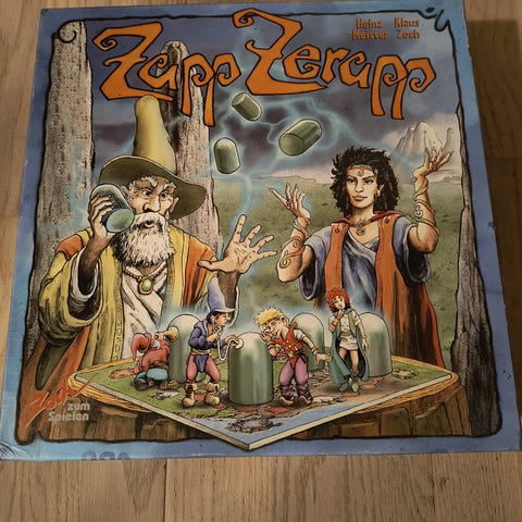 Zapp zerapp brætspil med spilleplade, figurer og instruktioner. Spillet indeholder forskellige komponenter til brug i spillet, herunder spillebrikker og kort. Velegnet til flere spillere og til underholdning ved sociale sammenkomster.