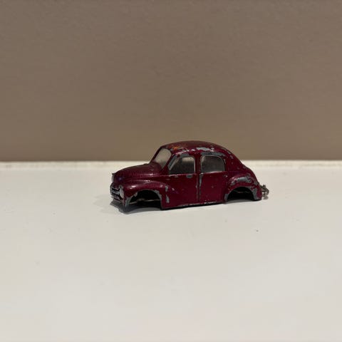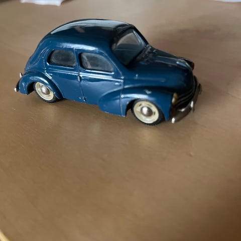 Vilmer Renault 4CV, har renset det meste af malingen af med brunsæbe behandling, blå oprindelig, malet over med rød, så klar til sidste overhaling hos ny ejer (jeg renoverer ikke). Står helt original med fine dæk, lygter og rude og hele kofangere