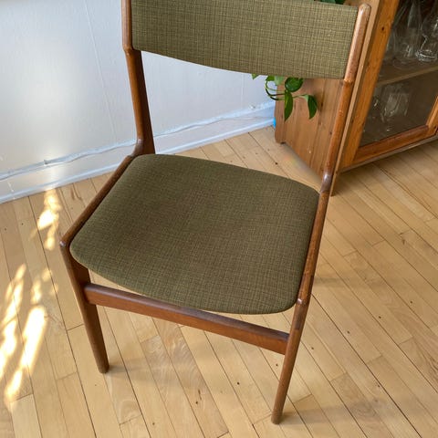 Spisebordsstol, Teak, Ældre teaktræsstol med brugsspor og hul i sæde sælges