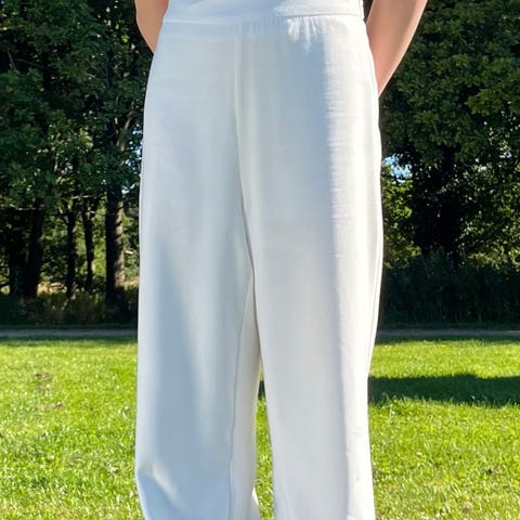 Smuk og enkel buksedragt med blonde ærmer og perlesnor omkring livet.