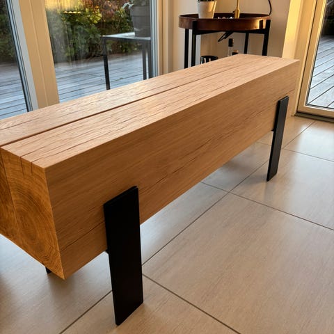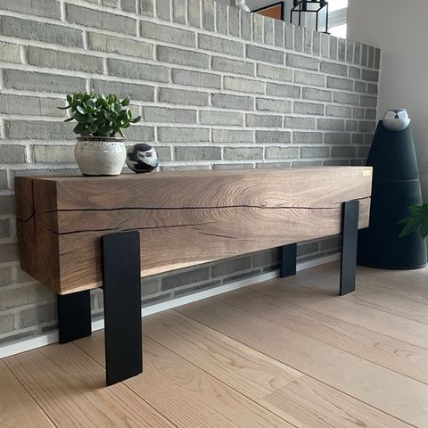 Svellebænk af 2 massive røget og olieret egesveller. L:130xH:50xD:31cm. Ben i 100x8mm. stål som er sandblæst og pulverlakeret. Kan laves på andre mål og i lys eg. Se mere på Instagram designbyfrom.