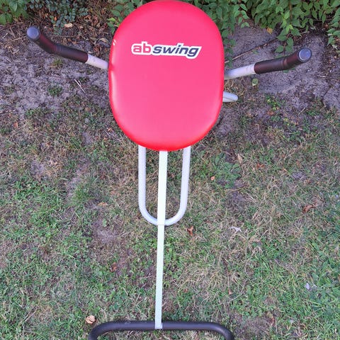 Ab Swing træningsudstyr med rød polstret støtte og metalramme. Designet til mavetræning og core-øvelser. Kompakt størrelse og bærbar konstruktion.