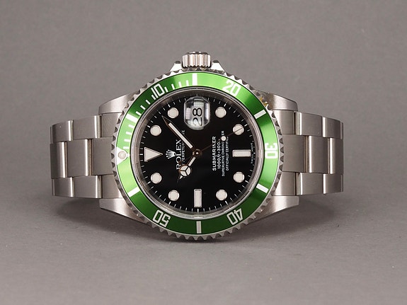 Moderne og farverig Rolex Oyster Perpetual 41 ref. 124300 med grøn skive, 41 mm urkasse i rustfrit stål og klassisk Oyster-lænke. Den fine grønne skive giver et friskt og livligt udtryk og gør denne model både iøjnefaldende og alsidig.