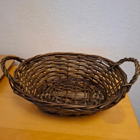 Denne flettede kurv er lavet af naturmateriale og har en diameter på cirka 20 cm. Kurven er brun og har et mønster med krydsfletning. Den kan anvendes til opbevaring eller som dekorativ genstand.