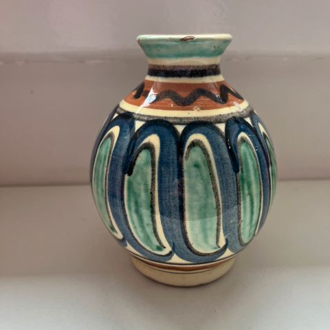 Keramikvase m. kalabasform. Lækker silkeblød glasur m. store elipseformede prikker i kønne pastelfarver på hvid bund.