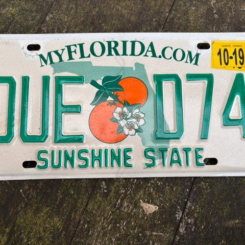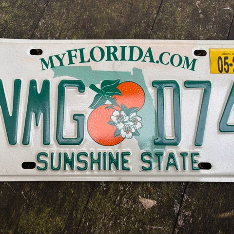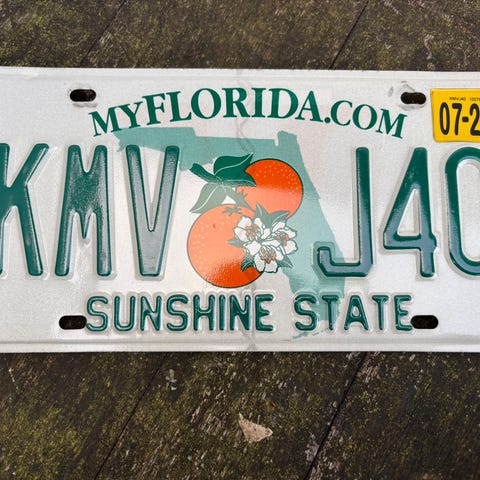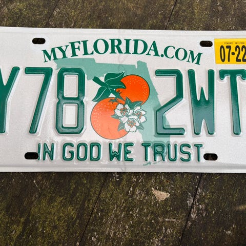 Florida in god we trust, ægte nummerplade stadig med klistermærke i rigtig flot stand trods kørsel.