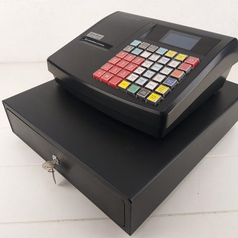EBM Cash Register Model CR 21 in black color. Features a keypad with multiple function keys, a display screen, a built-in receipt printer, and a cash drawer with compartments. Includes user manual and additional documentation. Suitable for retail or small business use.