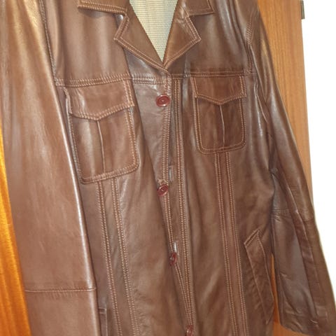 Læderjakke i brun farve til herre, størrelse L. Jakken er fremstillet af 100% skind og har lynlåslommer samt justerbare stropper ved ærmerne og taljen. Jakken er designet til udendørs brug og har et klassisk snit med krave.