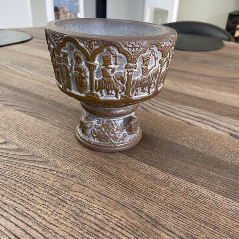 dåbsfont af keramik fra Michael Andersen & Søn på Bornholm.