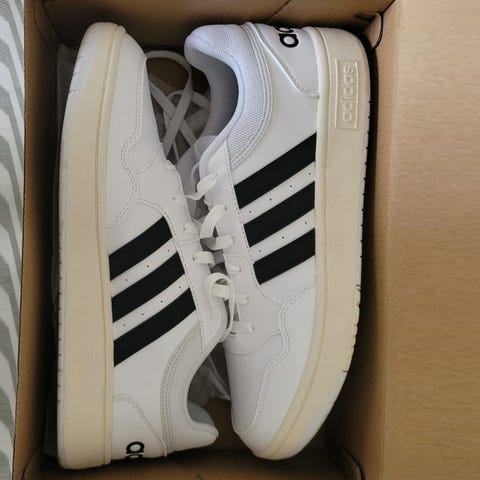 Adidas sportsko i størrelse 44 (UK 9 1/2) med hvid overdel samt mørkeblå og røde detaljer.